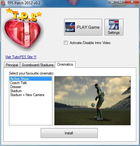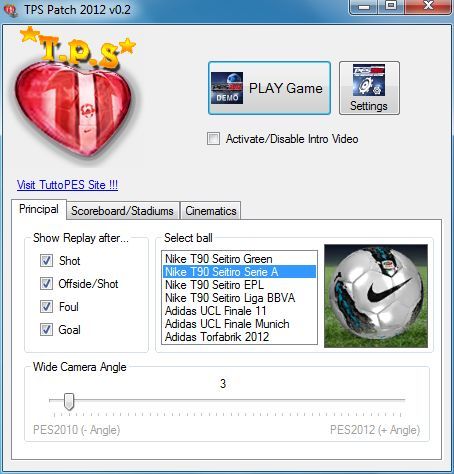 Features-Patch with selector-Ball Selector-PAD PS3 or XBOX-Scoreboard selector-New cinematics-Video Intro disable tool-New ball (Nike T90 Seitiro Green)-Kits updated-New chants-New adboards-Smoke pre-match-FIFA referee kits-5 stadiums (SanSiro, OldTrafford, CampNou, Emirates, StamfordBridge)-Camera angle tool-Replay disabler-Teams and formations updated: