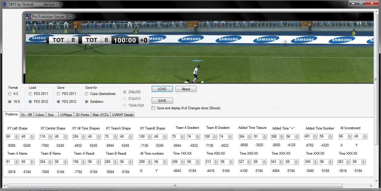 SBP3 is a scoreboard editor tool.v1.0 new features-Added Load and Save for Pes2011/Pes2012/Exhibition/Copa Libertadores scoreboards-Added UVMAP Details-Added option to save image from UVMAP Details-Added "Added Time Textures" UVMap, Size and 3D Points-Added Support for almost every scoreboard-Team A Gradient and Team B Gradient now have separated Sizes and 3D Points-Added Main XYZ's Positions-Added options to turn off animations for Time Shapes 1,2 and 3-Added option to display number of changes done-Added about button