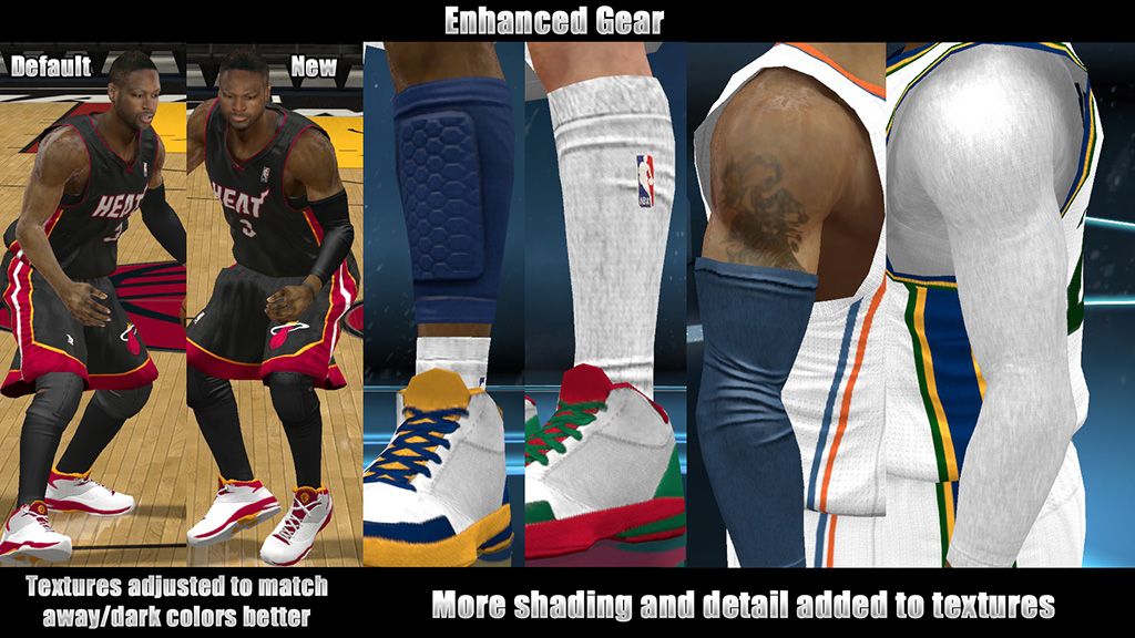 Enhanced Skin: This aims to improve the detail of the arm and leg textures, especially in comparison to the cyberfaces. To do this, I've adjusted the intensity of the arm/leg normal maps, and added a subtle skin overlay to each of their normal and AO maps. It also breaks up the default sweaty gloss effect on the arms.Update V3: Improved eye textures to eliminate the dark "zombie" effect. Reduced leg sweat and intensity of leg muscles.Update V2: Reduced sweat. Added missing leg normal map. Added new eye and tongue textures.Update V1.1: Fixed an issue with weird dark splotches on the skin - most visible on lighter skin tones.Enhanced Gear: This mod darkens the gear to better match dark/colored jerseys better (but not too dark to the point where the white textures look gray). It also adds more shading detail to the gear textures.Enhanced Suits: This mod simply adds a bit of color variety to the coaches' suits. The pants and buttons on the suit top are now colored differently.