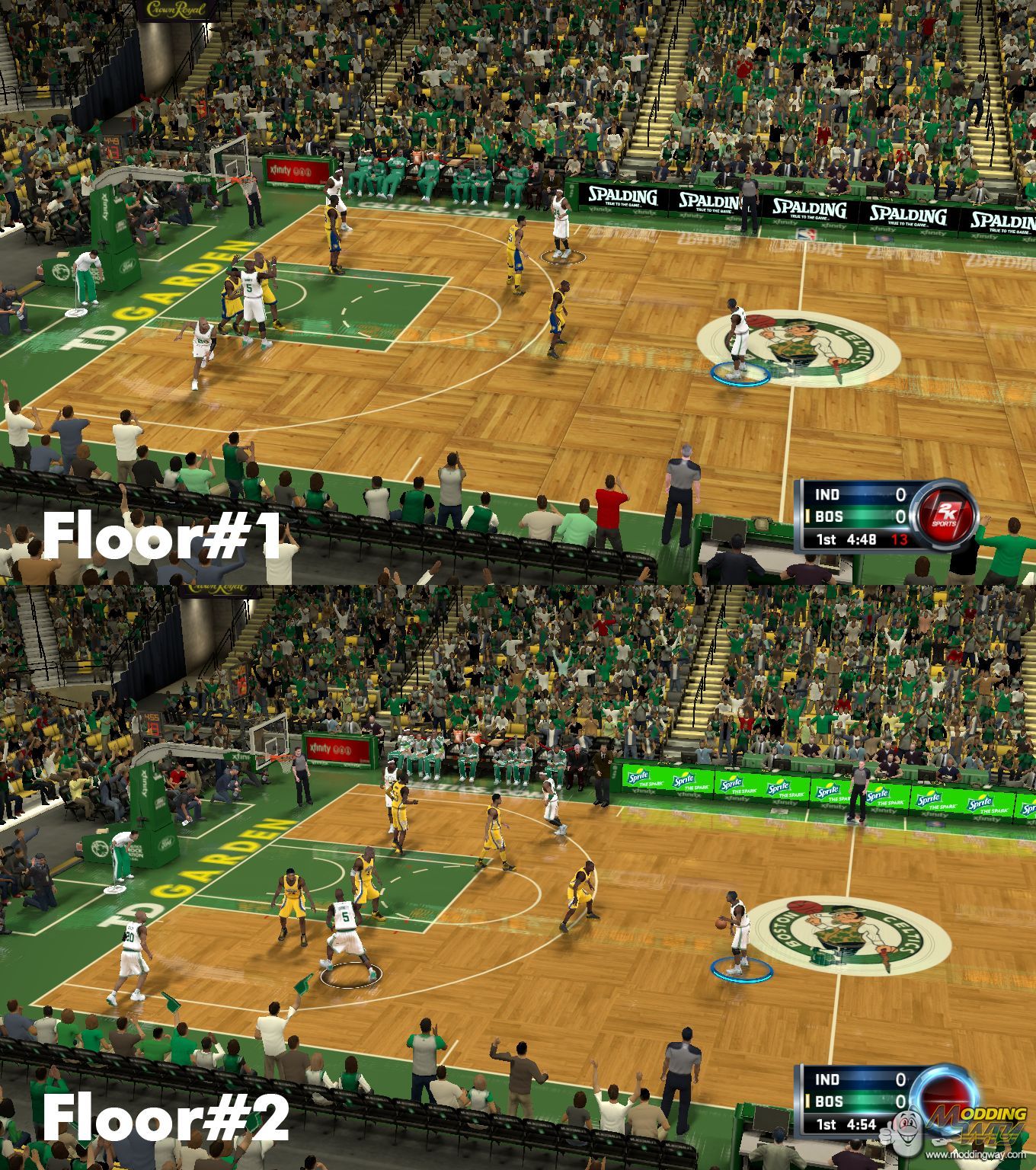 Updates the court for the Boston Celtics.Real backboard and stadium files.There are two versions: Parquet 1 and Parquet 2.Credits to JaoSming for the floor reflections and larger parquet. Credits also to utp1985 for the Parquet 2 floor texture.Real TD Garden baseline and website logos. CELTICS.COM on the left and @celtics on the right.