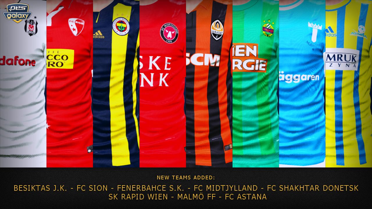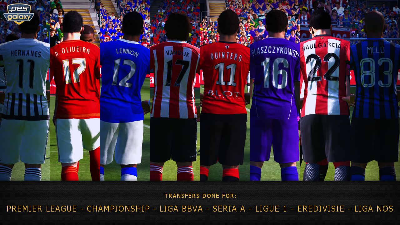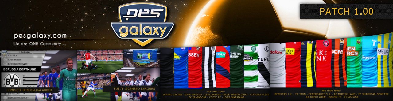 Pesgalaxy.com Patch 2016 1.00 FEATURES- Complete Bundesliga added with correct kits, logos, squads- All missing Champions League Teams added (BATE Borisov, Malmö FF, Shakhtar Donetsk, FC Astana, Dinamo Zagreb, ZSKA Moskva)- 10 more teams added (SK Rapid Wien, FC Sion, Fenerbahce S.K., Besiktas J.K., FC Midtjylland, Celtic FC, PAOK, FK Krasnodar, FC Viktoria Plzen, Legia Warszawa)- Missing transfers and many players done for Premier League, Championship, Liba BBVA, Serie A, Ligue 1, Eredivisie, Liga NOS- Premier League team names corrected and logos and kits added- Skybet Championship team names corrected and logos and kits added- Serie B team names corrected and logos and kits added- Brescia added to Serie B- Sassuolo Calcio team name corrected and logo and kits added- Liga ZON Sagres team names corrected and logos and kits added- All fake national and classic teams corrected and kits for all fake national teams- League and Cup logos and names corrected- Many coaches and stadium names corrected- Many correct Rivalries- Correct callnames for german and english teams- New Bootpack- New Ballpack- 561 new or updated faces for all leagues added. PES 2015 faces have been updated for PES 2016- Adboards by Majuh - DLC 1.00 included- 1.02.01 exe included- Online compatible- Turf Switch incl. Fruits', Tunizizou's and Estarlen Silva's turfs- Exe Switch(switch between no steam, steam exe and yair gameplay exe)- Faceswitch(Switch between no faces and new faces)- Controller switch(Xbox One/Xbox 360/PS3/PS4 buttons)- Scoreboard switcher with 14 scoreboards preinstalled (more can be added using the switch)- Sider 2.3 by juce- Sider options available using the switch- DpFileList Editor via switch- Crowd Switch (Default and River Jin's crowds) Patchteam:Hajnal30Borusse923011HDPantelG7Volun Credits: See credits.txt inside download
