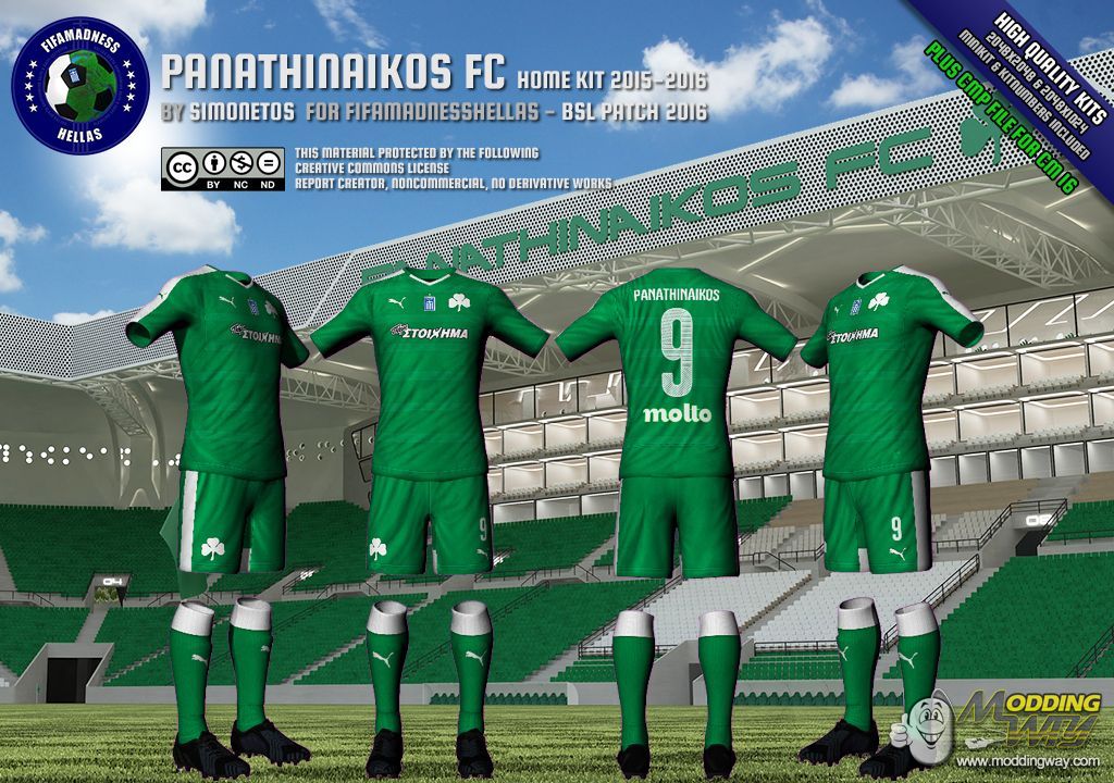 Dear friends, this is Panathinaikos FC home kit, in high quality, 2048x2048 for shirt and 1024x2048 for shorts, in RX3, DDS and CMP file format. Minikit and kitnumbers included.CMP CASEIn case you want to install this kit using CMP file, you'll need Creation Master 16 from here.RX3 & DDS CASEIn case you want to install this kit manually, using RX3 and DDS files, just extract the zip file and take the files you want.Kit files goes to "Origin Games\FIFA 16\data\sceneassets\kit" folder.Minikit files goes to "Origin Games\FIFA 16\data\ui\imgAssets\kits" folder.Kitnumber files goes to "Origin Games\FIFA 16\data\sceneassets\kitnumbers" folder.Note: Don't forget to regenerate using FHL BH EDITOR from here...... CREATIVE COMMONS LICENSE This material created by Simonetos - fifamadnesshellas.netand protected by the following Creative Commons License. ATTENTION!!! This material offered to you for personal use only.If you interested to use it in any kind of public patch, please first contact with author here!!!