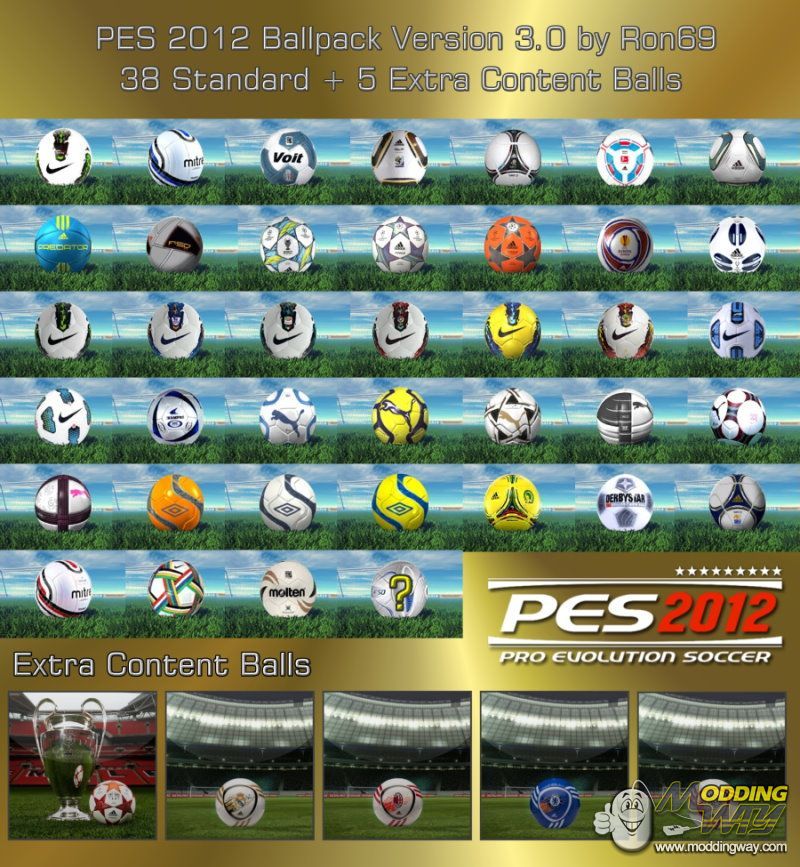 - Ballpack with 43 Balls - NEW: Adidas Comoequa CAF - NEW: Extra Content Balls Capitano Real Madrid, Chelsea, AC Milan, Ajax - NEW: Extra Content Previews - you can play with all Balls in the Game - actually and classical Balls - all League Balls (EPL, LFP, Serie A, Spor Toto, Bundesliga, Eredivisie) - new Ballpreview Style by Txak - for PES edit Patch 2.51/2.61 (correct Position) - compatible with all Patches - required DLC 2.01!! CREDITS: Txak, ppaaggpp,skills_rooney