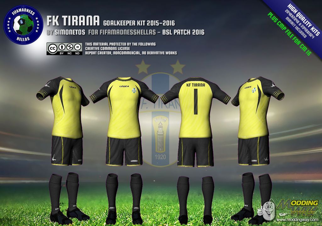 Dear friends, this is KF Tirana goalkeeper kit, in high quality, 2048x2048 for shirt and 1024x2048 for shorts, in RX3, DDS and CMP file format. Minikit included.CMP CASEIn case you want to install this kit using CMP file, you'll need Creation Master 16 from here.RX3 & DDS CASEIn case you want to install this kit manually, using RX3 and DDS files, just extract the zip file and take the files you want.Kit files goes to "Origin Games\FIFA 16\data\sceneassets\kit" folder.Minikit files goes to "Origin Games\FIFA 16\data\ui\imgAssets\kits" folder.Note: Don't forget to regenerate using FHL BH EDITOR from here...... CREATIVE COMMONS LICENSE This material created by Simonetos - fifamadnesshellas.netand protected by the following Creative Commons License. ATTENTION!!! This material offered to you for personal use only.If you interested to use it in any kind of public patch, please first contact with author here!!!