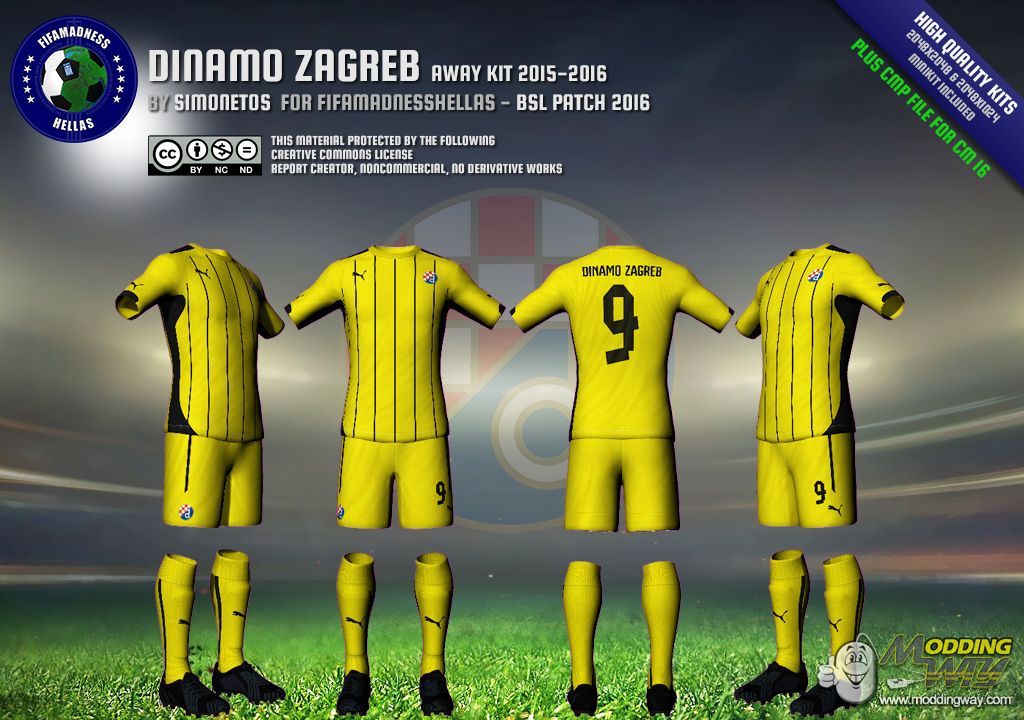 Dear friends, this is GNK Dinamo Zagreb away kit, in high quality, 2048x2048 for shirt and 1024x2048 for shorts, in RX3, DDS and CMP file format. Minikit included.CMP CASEIn case you want to install this kit using CMP file, you'll need Creation Master 16 from here.RX3 & DDS CASEIn case you want to install this kit manually, using RX3 and DDS files, just extract the zip file and take the files you want.Kit files goes to "Origin Games\FIFA 16\data\sceneassets\kit" folder.Minikit files goes to "Origin Games\FIFA 16\data\ui\imgAssets\kits" folder.Note: Don't forget to regenerate using FHL BH EDITOR from here...... CREATIVE COMMONS LICENSE This material created by Simonetos - fifamadnesshellas.netand protected by the following Creative Commons License. ATTENTION!!! This material offered to you for personal use only.If you interested to use it in any kind of public patch, please first contact with author here!!!