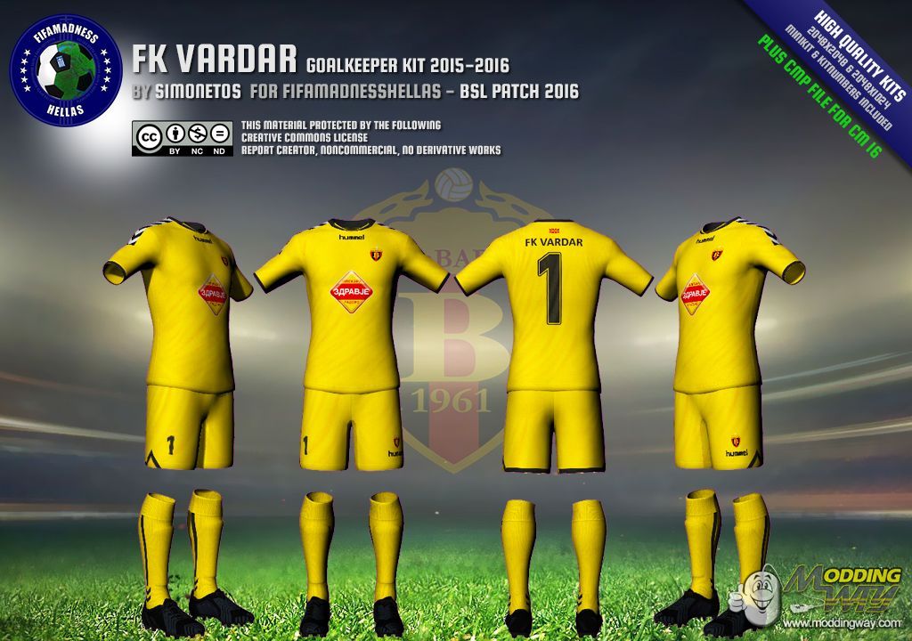 Dear friends, this is FK Vardar goalkeeper kit, in high quality, 2048x2048 for shirt and 1024x2048 for shorts, in RX3, DDS and CMP file format. Minikit and kitnumbers included.CMP CASEIn case you want to install this kit using CMP file, you'll need Creation Master 16 from here.RX3 & DDS CASEIn case you want to install this kit manually, using RX3 and DDS files, just extract the zip file and take the files you want.Kit files goes to "Origin Games\FIFA 16\data\sceneassets\kit" folder.Minikit files goes to "Origin Games\FIFA 16\data\ui\imgAssets\kits" folder.Kitnumber files goes to "Origin Games\FIFA 16\data\sceneassets\kitnumbers" folder.Note: Don't forget to regenerate using FHL BH EDITOR from here...... CREATIVE COMMONS LICENSE This material created by Simonetos - fifamadnesshellas.netand protected by the following Creative Commons License. ATTENTION!!! This material offered to you for personal use only.If you interested to use it in any kind of public patch, please first contact with author here!!!