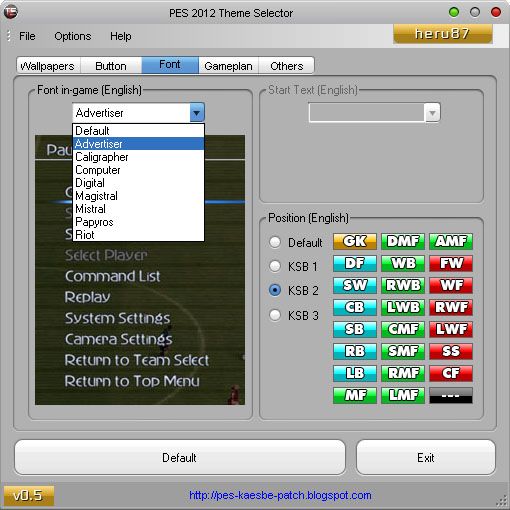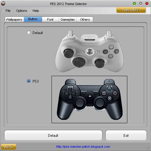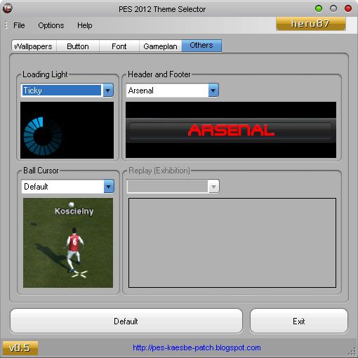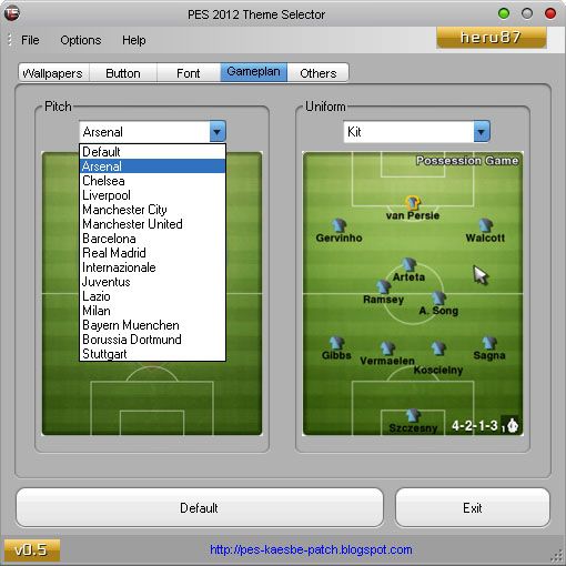PES 2012 Theme Selector 0.5Description: Tool for customize PES 2012.Features: 1. Customize wallpaper - Start Screen - Exhibition - UEFA Champions League & Prematch - Copa Santander Libertadores & Prematch - Cup - League - Community 2. Button 3. Font - Font in-game (English) - Position (English)* 4. Gameplan - Pitch - Uniform 5. Others - Loading Light - Ball Cursor - Header & Footer*new featureRequirements: - installed kitserver12 - installed .NET Framework (at least version 4.0) How to use:Setup kitserver path 1. Goto Options | Configuration 2. Browse kitserver folder 3. Browse img.dir folder 4. OKCustomize your PES > Do the changes (apply button deleted, check changelog) #Click Default to restore default KONAMI themeAuthor: - heru87Files: - Font maker: heru87, Soroush, Reza.K - Wallpaper maker: Sigit Setiawan, heru87, E.D el nino, agung25 - Misc: heru87, Tottimas, Jenkey1002 - Icon: heru87, Sigit Setiawan, www.freeiconsweb.comThanks to: - Juce for kitserver, barcafan, obocaman, Fabim Galoucura - fajar, cilut14, cuplis16, crystalZu, hend_yuk & brantas community - Yigit Akyol, Albert Bikaj, Fadi Alkam, Gabrijel Prusina - PESEdit, PES Gallery Patch, Illyria Patch, PES SMoKE Patch - pespatchs.com, moddingway.com, pes-smoke-patch.blogspot.com - DigiQ8, chrisholey, siiwoncreative, patrik7, padi89, ereen, t1kiet-connection, Mikeaprendiz91, fillajo, spakkietto, l4zth30n3, fungila, jayluv, abrararticocean, tolio_design, taher1986, karmpooh12, t_ton, sord-19, s7mu, lako designs, bagaz-bmg - all contributor and anybody which I forgot ;-)Beta tester: - agung25, E.D el nino, Suwahadi, Rafi