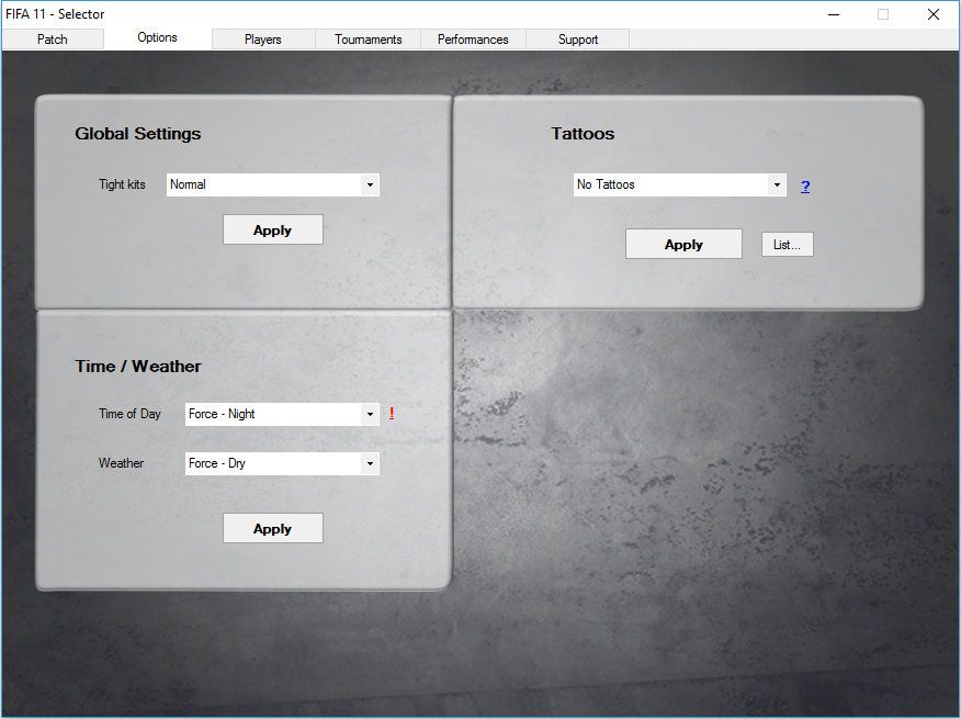 - FIFA 11 Config (original FIFA 11 tool)* Updated layout- optional (can be turned on/off):* new gameplay (from game fifa online 3)* New scoreboards * New music * tattoos for players* Performance Optimizer- reprogrammed files (.lua files): as based on the work of scouser09 's Revolution Modmakes it possible to add new features to the game, wich are fully online compatible:* new faces (now online compatible)* kits: away/3th GK kits, specific referee kits, ...* shoe assignments: unlimited shoe-ids can be assigned (+ now online compatible)* balls: assign winter/snow balls* adboards: assign specific adboards to teams* tattoos: assign playerskins (tattoos) to players* goalnet-coulours: assign goalnet-coulours to specific teams/stadiums (+ now online compatible)* kit name-fonts: can be assigned outside the database (+ now online compatible)* arena: assign stadium & gk kit* 'classic' graphics: assign specific textures (adboards, balls, referee kits, ...) to the classic kit wich is selected* (winter) accessories improvements* ...garanteed compatibility with online mode: no missing textures, ... for other playersSupported languages: english, Czech, dutch, french, german, hungary, italian, spanish (2X), portuguese, polish, russianInstallation:1. install fifa 112. install ea patch (1.01)3. install 2016-17 patch (v0.5) for FIFA 11* run installer "2016-17 patch (v0.5) for FIFA 11 (part 1 of 2).exe"* run installer "2016-17 patch (v0.5) for FIFA 11 (part 2 of 2).exe"Notes- Selector dont start up (if u have .net 2.0) : copy included "Selector (.NET 2.0 version)" folder content to FIFA 11 folder- problems with commentaries (crashes, not appearing ingame, ...): http://www.soccergaming.com/forums/s...&postcount=481- crashes, ...: use the "i68 regenerator" (select "take care of edited files..." > go , can take some time)