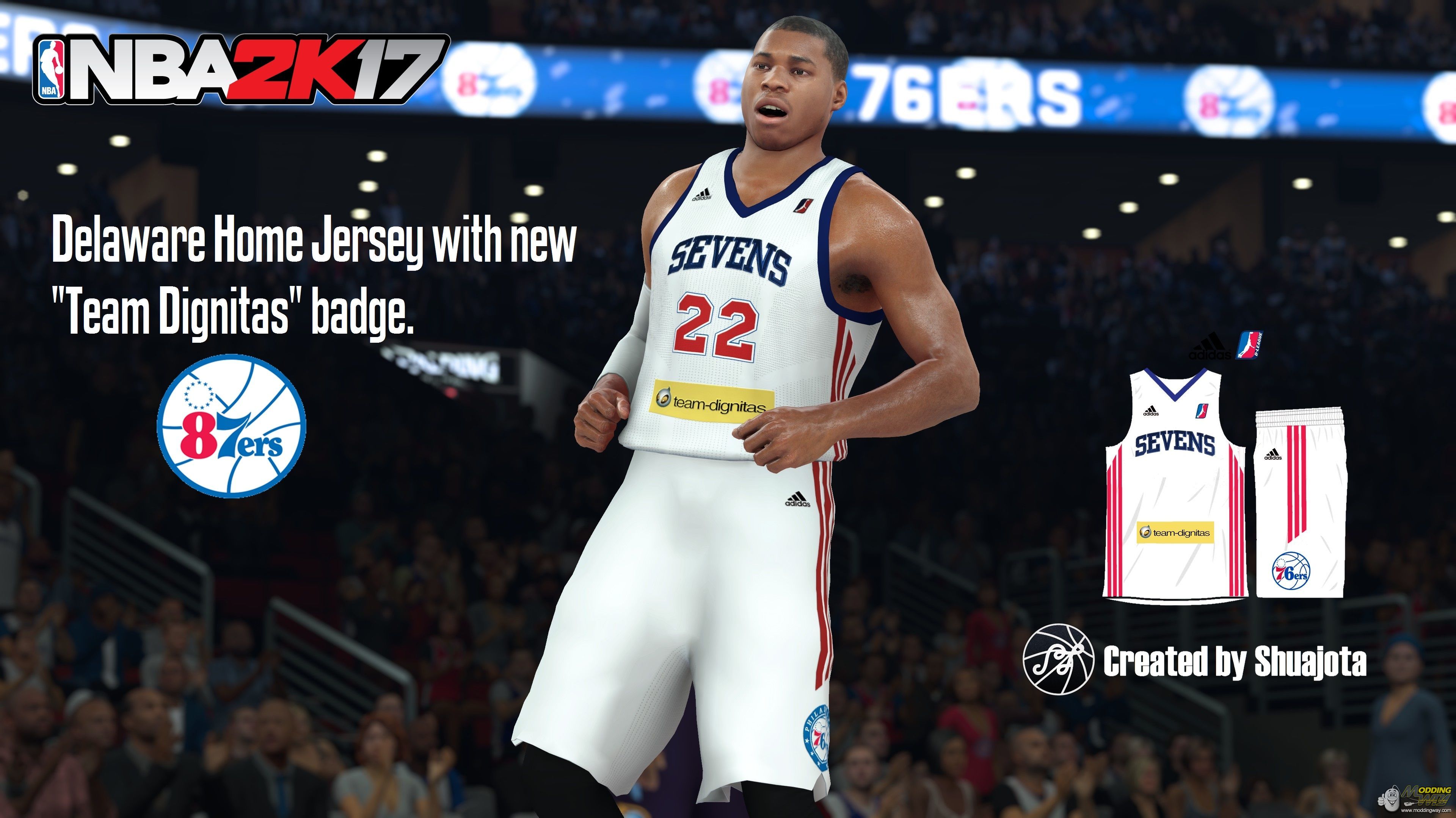 This mod adds the Delaware 87ers home jersey updated with "Team Dignitas" badge and real textures for your NBA 2K17.