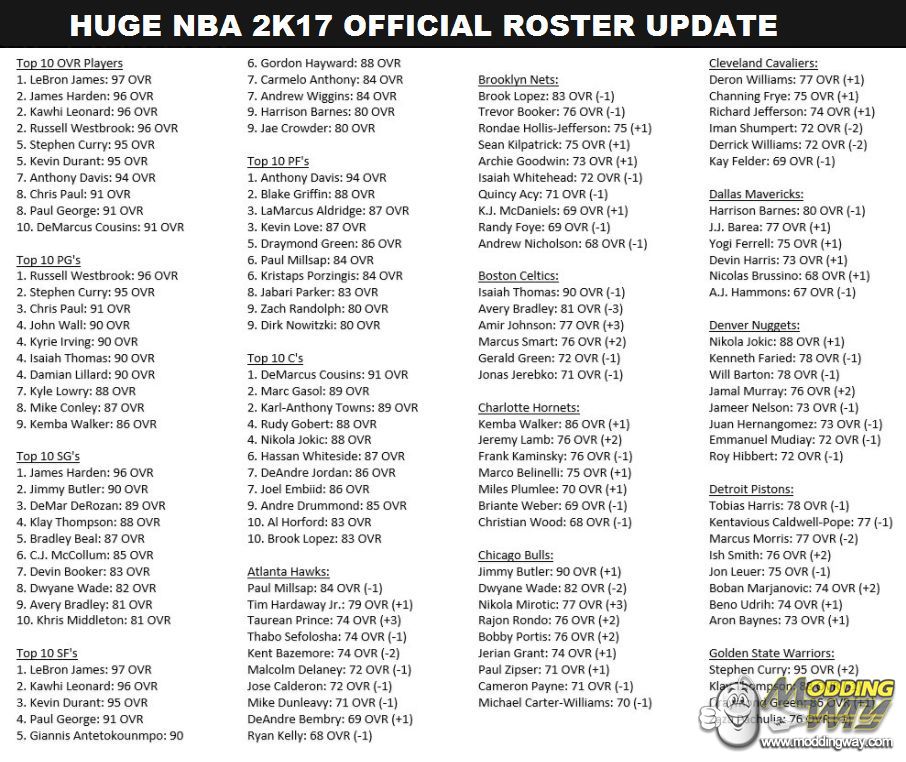 Download NBA 2K17 Huge Official Roster Update (Play-Offs) 04-19-2017. This is a mod for NBA 2K17 video game.
