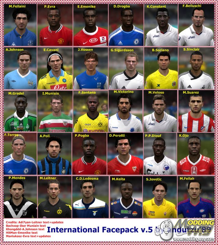 International Facepack v.5This pack contains next 30 faces:Kim OjoMohamed FellahMuhammed KeitaMoritz Leitner – texture by adi7yan+updatesEmmanuel Emenike – texture by HitmanDidier DrogbaFernando TorresPaul PogbaPatrice Evra – text by manlukasz+updatesAdam Johnson v.2 – text by khangdddMiguel VelosoKevin ConstantFernando BelluschiAndrea PoliMarouane FellainiEdison Cavani v.2Max GradelIker Muniain – text by BachxopFelipe SantanaMauricio VictorinoMario SuarezPedro MendesCristian Daniel LedesmaStevan JoveticPape Pate DioufDiego PerottiScott SinclairBruno SorianoGylfi SigurdssonJelle Vossen