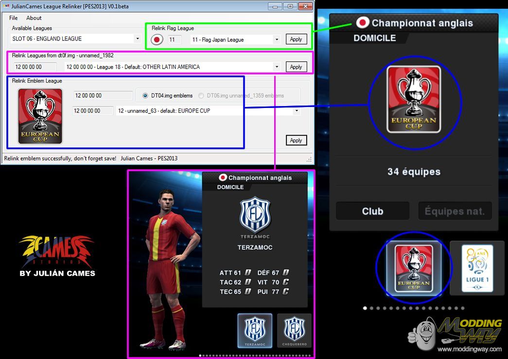 Framework .NET required. Tested on pes2013.exe V1.03 and V1.04. INSTRUCTIONS: 1. Make a backup before. 2. Open pes2013.exe 3. Select a league from available leagues combo box: 4. Relink the selected league: - Relink Flag - Relink composition league (from dt0f.img unnamed_1982): - Relink emblem (from dt04.img or dt06.img): Press APPLY, don´t forget save! 5. Save the exe file. Please report bug to: juliancamespatchs@yahoo.com.co juliancames.blogspot.com @juliancames_pes