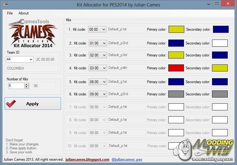 #[Julian Cames Kit Allocator] Julian Cames Kit Allocator is a tool for edit UniColor.bin. UniColor.bin is a PES2014 file that stores the allocation of kits and their associated colors. UniColor.bin set the allocation for 1st, 2nd, 3rd, 4th, etc., kit for each team PES2014, maximum 10 kits per team. UniColor.bin is located in dt32.cpk, and in DLC dt50_001.cpk from: pes14_win_datcommoncharacter0modelcharacterappearanceuniform, you must edit from the last DLC available. Requires: - Framework .NET 4.5 Use: - Works with UniColor.bin Zlib compressed. (11KB) 1. File -> Load UniColor.bin... 2. Select TeamID 3. Make your changes 4. Press Apply button for each TeamID 5. File -> Save... #[Julian Cames Zlib/Unzlib tool] This tool is just to compress/decompress zlib format files. by juliancames.blogspot.com