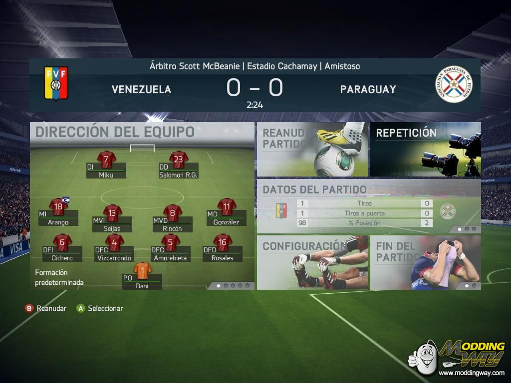 ----------------------------------------------------------------------- Inglesa) Copy the contents of the "Venezuela" folder in the main folderFIFA 14. overwrite files that asks you to do.b) Run ModdingWayInstaller.exe file from your home folderFIFA 14 (Run as administrator)c) ReadyD) If you want, the theme to your FIFA 14 Venezuela go to selectormoddigway.ir Select a Theme section and choose the song calledVenezuela then apply theme give in and go.Note: Changes will look in the database 4.0contains:Faces of all equipment Venezuelan By Son.Of.GodMinifaces all equipment Venezuelan By AnibalRomeroTTheme Venezuela for Fifa 14 By Anibal RomeroTAdboards, Flags and Banners By Fernando Perez4.0 Database updating the teams Venezuela and Paraguay .. Fully compatible with 1.5.1 Moddigway