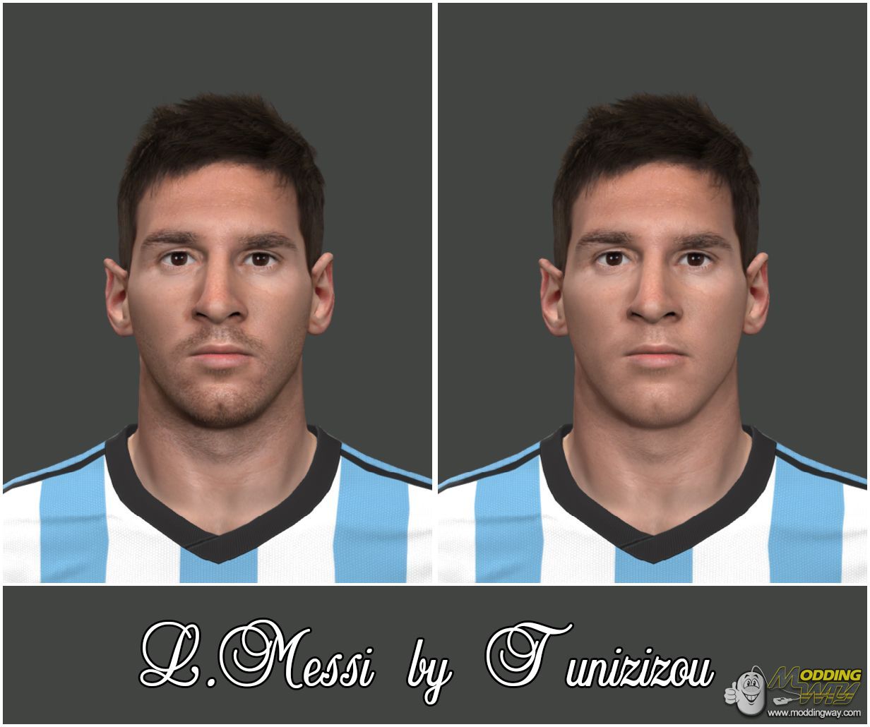 *************************L. Messi By Tunizizou*************************Choose your favorite version :V1 : BeardV2 : No beardand copy 7511 folder to pes14_win_datcommoncharacter0modelcharacterface eal