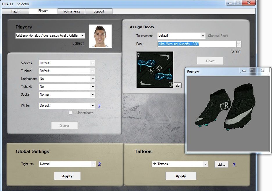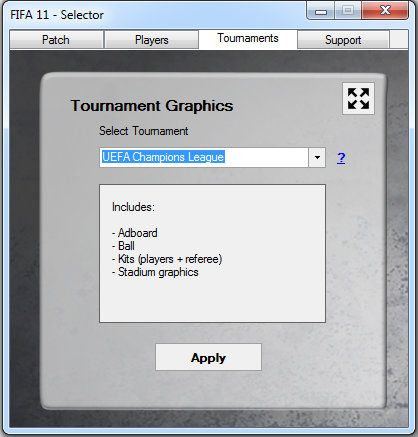 included:- FIFA 11 Selector* New: tournament graphics: change to (Champions league, EL, WC, ...) graphics (= linked adboards, kits, shoes, stadiums, ... will appear ingame)* New: boot assignments - 3D (-render) preview of boots* New: boot assignments - assign boots for a specific tournament to players (CL, EL, WC, ...)* New: Arena Stadium - added "Random stadium" : let game chose the Arena Stadium randomly* Arena Ball - List updated + 3D (-render) preview added* fix: player assignments - errors* improvements* removed: English commentary- db* date 17.10.2014* Online & Offline version* improvement: more realistic player behaviours (--> xtra (unknown) player traits added)* New league: Turkish liga* New promoted teams* career: added turkish league, cup, supercup (+ CL/EL tickets)* career: update supercup teams* career: update CL/EL final stadium- kits* all 2014-15 kits (FIFA 15 + improvements)* classic kits (from fifa 15)* xtra GK kits (random chosen at each match)* Champions league kits (+ correct numbers/fonts)* update referee kits: english leagues, CL, EL- New ballsadidas brazuca Final Rioadidas brazucaadidas Cafusa OMBadidas torfabrikadidas MLS OMBadidas Pro Ligue 1 OMBuhlsport Ligue 2 Official Match BallDerbystar Brillant Design EredivisieNike Incyte - SaudiNike Incyte STSLNike OrdemNike Ordem - EPLNike Ordem - LFPNike Ordem - Serie ANike Ordem CBF (brazil serie a OMB )PUMA SERIE BPuma evoPOWER OMBUmbro BlackUmbro Ceramica - White/Black/VermillionKappa LocustaVoit Liga MX-BBVA OMBhummel Concept+Mitre Delta V12Sadidas Europa Leagueadidas torfabrik - YellowNike Ordem - Hi-VisNike Incyteadidas f50 X-ite - Glow/Earth Green/Solar Zestadidas f50 X-ite - Solar Zest/Black/Vivid Berryadidas f50 X-ite - Solar Blue/White/Solar Zestadidas f50 X-ite - Black/White/Solar Goldadidas f50 X-ite - Solar Blue/Solar Pink/Blackadidas f50 X-ite - Solar Green/White/Solar Pinkadidas Predator Glider - Black/Solar Red/Power Redadidas Predator Glider - Solar Blue/Black/Solar Pinkadidas Predator Glider - Solar Green/Blue/Solar Pinkadidas Predator Glider - Solar Red/Black/Solar Goldadidas Predator Glider - White/Black/Solar Pink/BlueWarrior Superheat - White/Gold/RedWarrior Skreamer Proadidas Conext 15 OMBhummel BladeUnder Armour 695 OMBSELECT Brillant Super OMBPenalty Campo Pro S11Lotto Twister - White/Black/Redadidas Tango 12 - White / Blackadidas Jabulani* + winter balls (for option 'use winter balls' at Selector)Nike Ordem - Hi-Vis (EPL, LFP, serie a)adidas torfabrik - Yellow (bundesliga)adidas Pro Ligue 1 OMB - yellow (ligue 1)uhlsport Ligue 2 - yellow (ligue 2)- faces* Newest FIFA Online 3 faces (= FIFA 15 + exclusive F03)200+ faces from the Barclays Premier League, ...) --> http://www.easports.com/fifa/news/20...yer-head-scans...+ some improvements (fifa 15 mods)- body/jerseys* Update legs model* improvement: kit patterns (restored to original fifa 11)- shoes* 175 New/updated shoes* correct models (nike magista "socks", ...)* improvements: less texture files used by game- banners & flags* 630+ updated banners (from fifa 12,13 + mods)* 870+ updated flags (from fifa 12,13,14,15 + mods)- adboards:* argentina league (team)* Champions league/Europa league* Spain la liga (team) (update)* english leagues (team) (update)* ...- New goalnet colors:* Anfield* Parc des Princes* Etihad Stadium* Estadio Vicente Calderon- mini faces* 30000 updated from fifa 15- team/league updates* Updated logos & names (all licensed)* all team logos redone (flat logo - style)- Tournament graphics (can be enabled/disabled with Selector)* FIFA Club World CupAdboard* Eng. Capital One CupAdboard* Eng. FA Community ShieldAdboard* Eng. FA CupAdboard* UEFA Champions LeagueAdboardBallKits (players + referee)Stadium graphics* UEFA Europa LeagueAdboardBallKits (referee only)* UEFA Super CupAdboardBall* UEFA EURO 2016Adboard* UEFA EURO 2016 QualifiersAdboard* FIFA World Cup 2014AdboardKits (referee only)* FIFA Confederations Cup 2017Adboard* Copa Bridgestone LibertadoresAdboardBall* CONCACAF Champions LeagueAdboardBall* AFC Champions LeagueAdboardBall- Stadiums (same as 2013-14 patch)* Etihad Stadium (mancity)* BC Place Stadium (Vancouver Whitecaps)* Molton Road (generic stadium)* Arena da Baixada (Atlético Paranaense)* Arena Corinthians (Corinthians)* Fonte Nova (Esporte Clube Bahia)* Estádio Beira-Rio (Sport Club Internacional)* Mineirão (Cruzeiro Esporte Clube)* Estádio do Maracanã (brazil national team, Flamengo, Fluminense, Botafogo)* Arena Amazonia WC'14 (avaible as Arena Stadium only)* Arena Pantanal WC'14 (avaible as Arena Stadium only)* Arena Pernambuco WC'14 (avaible as Arena Stadium only)* Estádio Castelão WC'14 (avaible as Arena Stadium only)* Arena das Dunas WC'14 (avaible as Arena Stadium only)* Estadio Nacional WC'14 (avaible as Arena Stadium only)- New intro* Intro moviesNo Intro-movieFIFA 15 - DefaultFIFA 15 - Long intro* New startup screens- Game menus* updated menu players- game stability/performance/functions (.lua files)* fix: New "specific" faces not appearing at menu 'edit player'* overall improvements (for less crashes at arena)* ...+ Features from 2013-14 patchRemoved:* English comentary --> can be seperate downloaded (see Add-ons)* db: no brazil league (coming later) --> fifa 15 leagues onlySupported languages english, Czech, dutch, french, german, italian, spanish (2X), portuguese, polish, RussianInstallation:1. install fifa 112. install ea patch (1.01)3. install 2014-15 patch (v0.5) for FIFA 11* run installer "2014-15 patch (v0.5) for FIFA 11 (part 1).exe"* run installer "2014-15 patch (v0.5) for FIFA 11 (part 2).exe"Notes- Selector dont start up (if u have .net 2.0) : copy included "Selector (.NET 2.0 version)" folder content to FIFA 11 folder