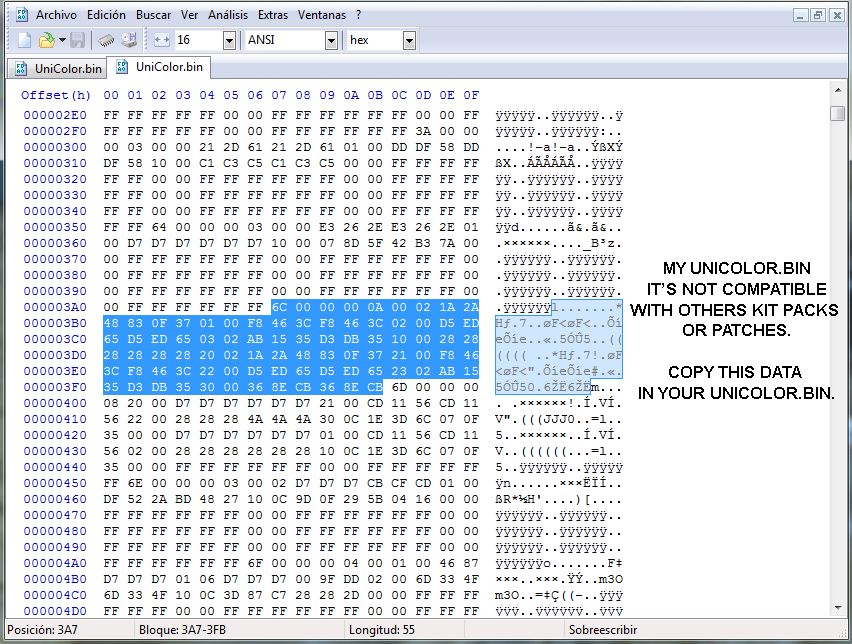 · Mi archivo UniColor.bin no es compatible con otros packs de kits o parches. Copia los datos en tu UniColor.bin (Mira la Imagen Unicolor FCB).
