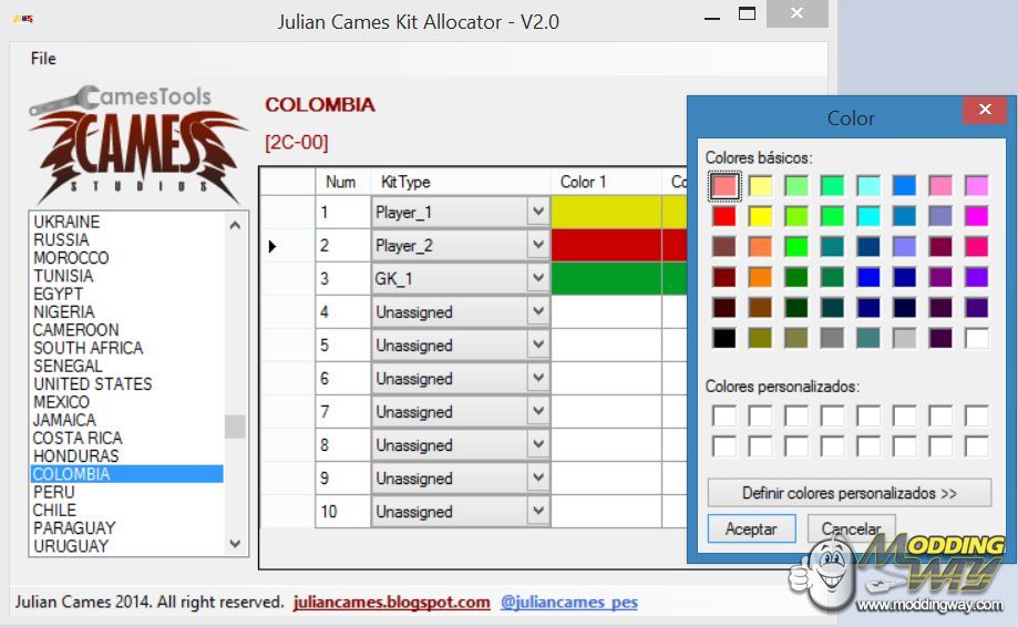 The kit allocator tool for PES2015. UniColor.bin editor.Usage:1. File -> Load UniColor.bin...2. Select Team.3. Make your changes.4. File -> Save...by @juliancames_pesjuliancames.blogspot.com