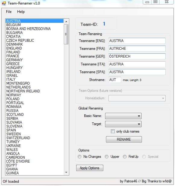 Platforms: - PC Features: - Edit Teamnames in 5 languages (English, Frensh, German, Italian, Spanish [more to come...]) - Edit Shortnames - Global Renaming: Take teamnames from one language and copy them to all other or one other language (option for "only club-teams" available) - Spelling Options: Upper Case letters (e.g. FC BAYERN MÜNCHEN) & FirstUp letters (e.g. Fc Bayern München) [Special letters (e.g. FC Bayern München) in future versions...] Requirements: Installed .NET Framework (at least version 2.0) How to use: 1. Open PES2010_EDIT.bin with Team-Renamer 2. Do the changes, don't forget to press Enter after every change! 3. Save PES2010_EDIT.bin change-log: version 1.0: - First release! Thanks to: Big thanks to w!ld@ for his help and his checksum and of course thanks to all other editor creators