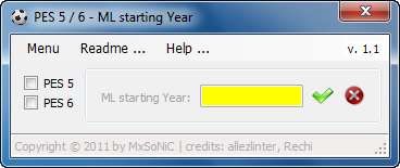 PES 5 / 6 - ML starting Year 1.1 -------------------------------- description: Tool for PES 5 / 6. supported platforms: 1. PC only features Settings: 1. change the starting Year from your ML requirements: 1. installed .NET Framework (at least version 3.5) how to use: 1. open PES 5 / 6 exe 2. change the starting Year and push the green Arrow 3. save PES 5 / 6 exe thanks to: Ariel, Rechi, allezlinter, moddingway, PSO and pescorner Team changelog: version 1.1 add: fit for PES 5 and PES 6